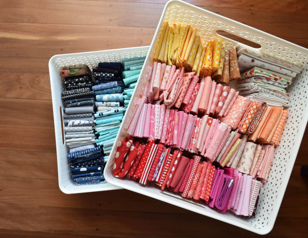 I keep my fab­ric in col­our coordin­ated stacks. So, it just makes sense to col­our coordin­ate my scraps in the same way. I wish I had end­less room for stor­ing scraps but I just don’t. With that in mind I pur­chased a few of these tubs from Kmart Aus­tralia. I use them for my good sized scraps. That is, pieces of fab­ric that are lar­ger than 10″ x 10″ square but smal­ler than a fat quarter. Being stack­able and light­weight makes the tubs easy to move in and out of my fab­ric cup­board.